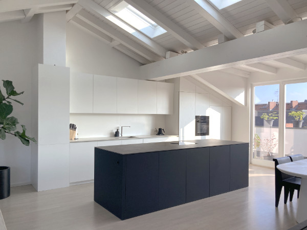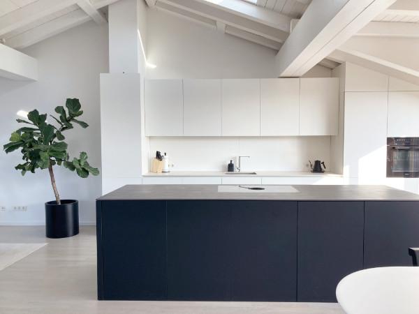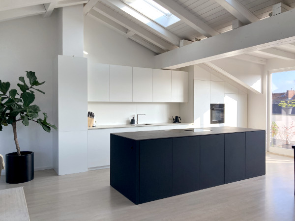 Diese phantastische Edelküche in einem wunderschönen ausgebauten Dachgeschoss sollte der Blickfang beim Reinkommen werden. Das ganze Entrée hat ja schon einen Wow-Effekt, dennoch wirkte die Küche vor unserer Arbeit durch ihre schlichten weißen und schwarz-braunen Melaninplatten doch nüchtern und sehr steril.