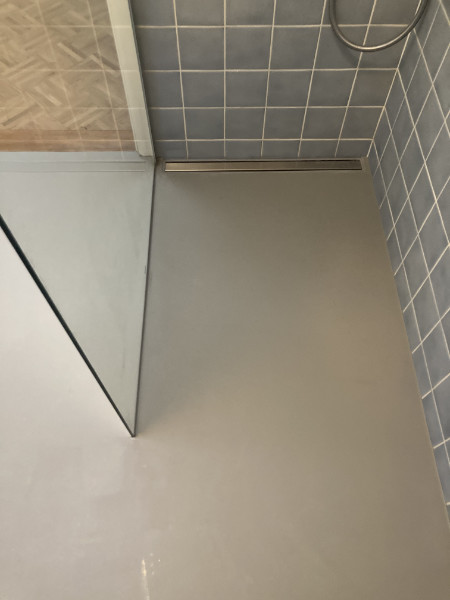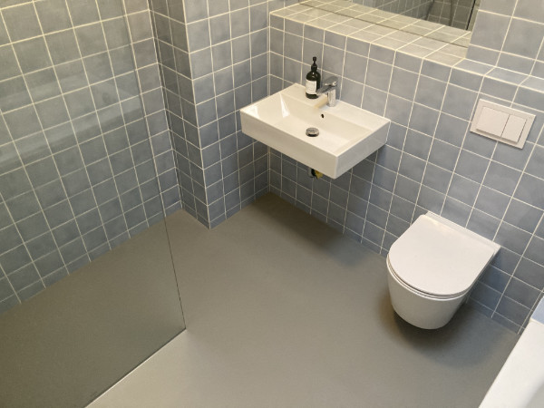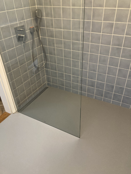 Bevor wir loslegen konnten, musste der Boden natürlich erst gründlich austrocknen, um spätere, erneute Rissbildung zu vermeiden. Auf den Bildern sieht man auch sehr schön den Unterschied zwischen der Hochglanzoberfläche des neuen, gegossenen Epoxidharz-Bodens und der anschließenden matten Versiegelung. Die Kundin wünschte sich wieder eine Betonoptik zu ihrem Bad und wir finden, es ist superschön geworden und sieht wieder aus wie neu!