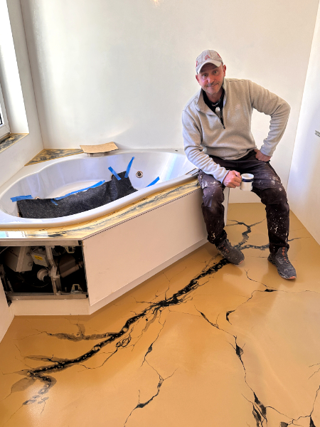 Hier wurde der Boden in hellem Grauton schon vorgrundiert und dann mit zwei silber-metallicfarbenen Epoxyschichten überzogen, um einen tollen 3D-Effekt zu erzielen. Mit einer Feder kam dann noch eine besonders natürlich wirkende, handgemalte, schwarze Marmorierung obendrauf. Deren Adern sollten zum Club-Logo laufen, das den Mittelpunkt des Raums ausmacht und welches nach der Aushärtung aufgebracht wurde. Abschließend wurde eine robuste Versiegelung aufgebracht, damit dieser spektakuläre, rockige Glitzer-Boden auch lange Zeit diese schöne Optik behält.